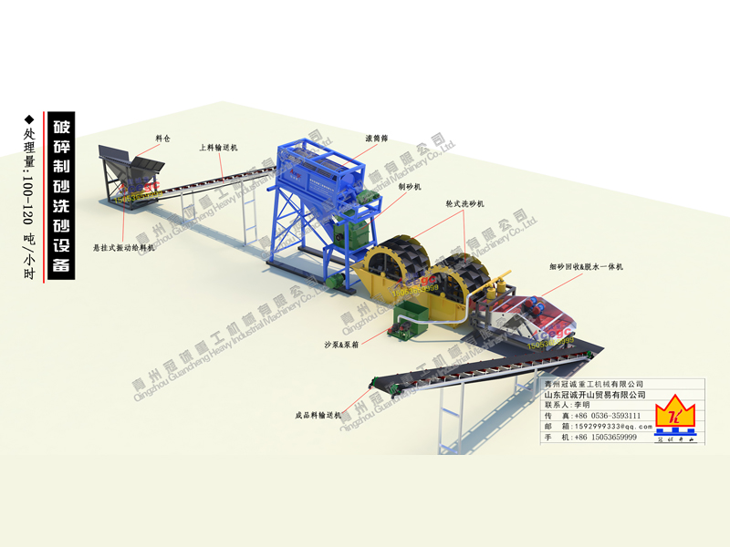 原料通過工程車輛送入進料倉,由進料倉底部的振動給料機均勻給料進入一臺顎式破碎機內(nèi)進行粗破,破碎后的物料與振動給料機篩分出的細料一同由輸送機送入滾筒篩內(nèi)進行篩選分級為粗料與細料兩種規(guī)格;細料直接通過溜槽排入洗砂機內(nèi),粗料進入制砂機進行破碎制砂,然后由一臺沙泵打入洗砂機內(nèi)。