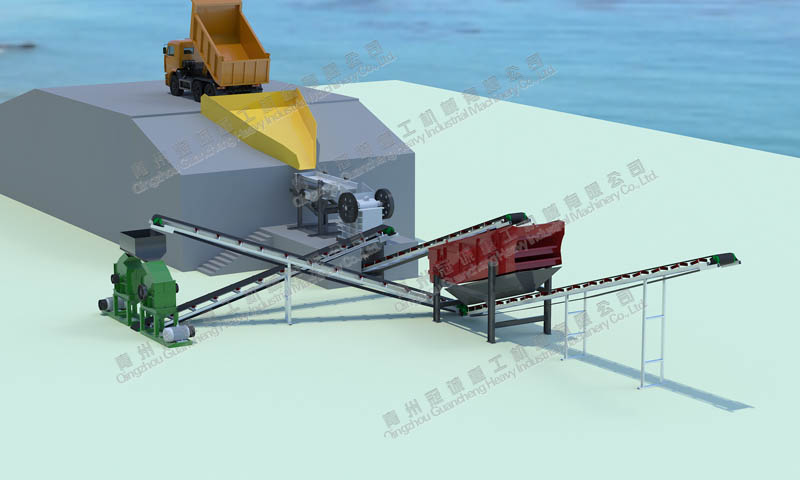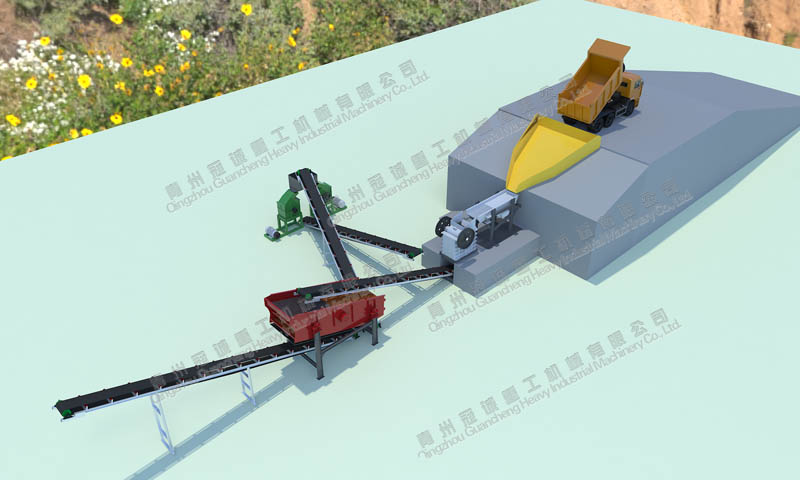 原料通過工程車輛送入進(jìn)料斗,由進(jìn)料斗進(jìn)入振動(dòng)給料機(jī)內(nèi)均勻給料進(jìn)入一臺(tái)600*900鍔式破碎機(jī)或者一臺(tái)1416#重錘破碎機(jī)內(nèi)進(jìn)行粗破,破碎后的物料通過上料輸送機(jī)送入一臺(tái)2160#振動(dòng)篩內(nèi)進(jìn)行篩選分級(jí)為:4mm以下與4mm以上兩種規(guī)格;